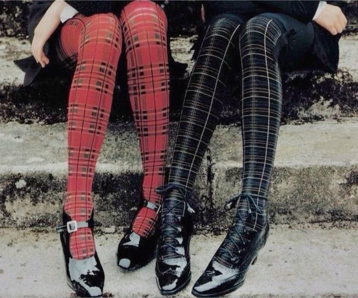 Tights were created in 1803 as a replacement for the petticoat. They were thought to provide warmth to women while promoting modesty and allowing women to wear dresses year-round. This idea of a modest tight was hijacked (for the better) in the 1960s. British designer Mary Quant pioneered colorful tights to accompany mini skirts and hot pants. Hot pants were a 1960s form of the micro-short—short shorts common in women’s fashion, also designed by Mary Quant. Quant’s colorful pantyhose were seen as a sign of youthfulness and freedom, directly juxtaposing the modest origin of the clothing article and establishing that different periods can shape the notions associated with specific clothing pieces. Moving on to the 1970s, the patterned, funky tights as we know them today began their crusade into women’s fashion. Icons, including Madonna, flaunted these funky leg accessories on stage and in everyday wear.