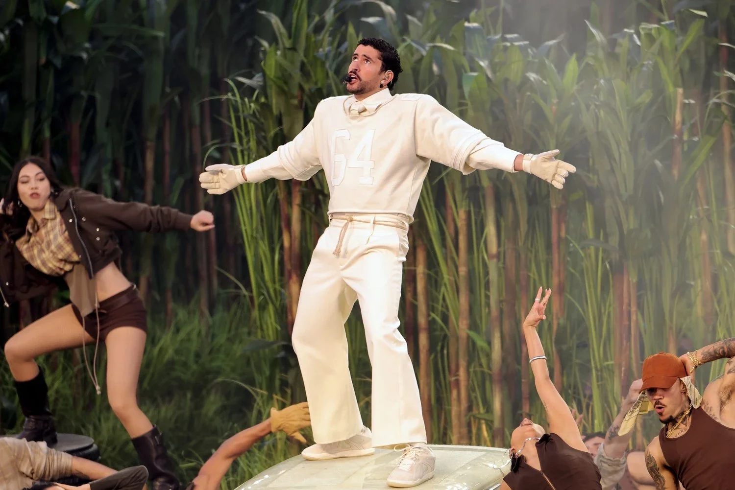 He sang entirely in Spanish, choosing not to translate himself or soften his voice. Meaning traveled through rhythm, movement, and clothing. The jersey and the suit, along with the dancers’ pavas and flowing skirts, framed the performance but also anchored it. They reminded viewers that identity is not something to edit to belong.
