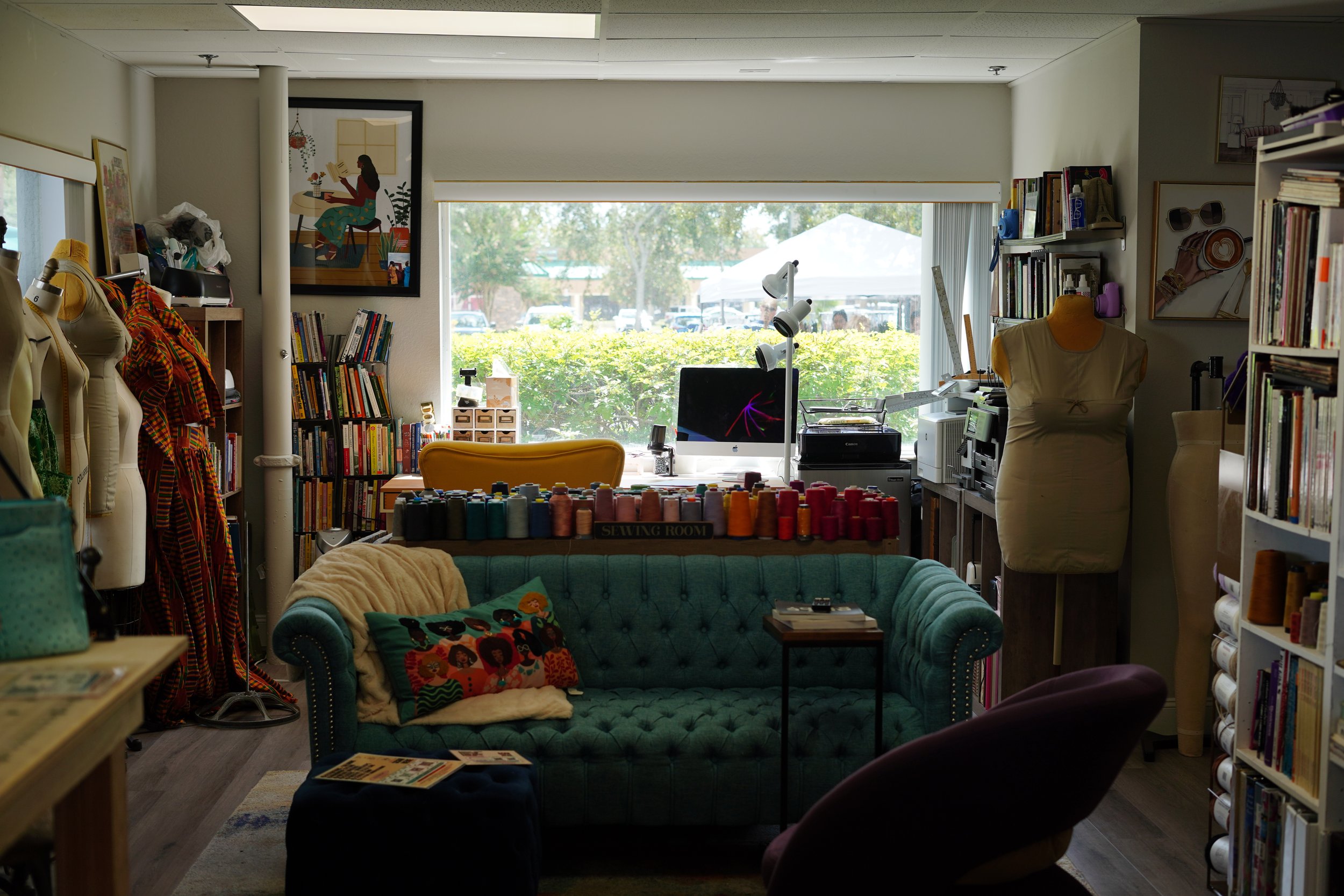 Since then, Michael has used her creative space to sell her collection by appointment and market her resources to the public. She continuously cements her place in the community— offering a work space, leading specialized sewing classes and facilitating free sewing days on the weekends.