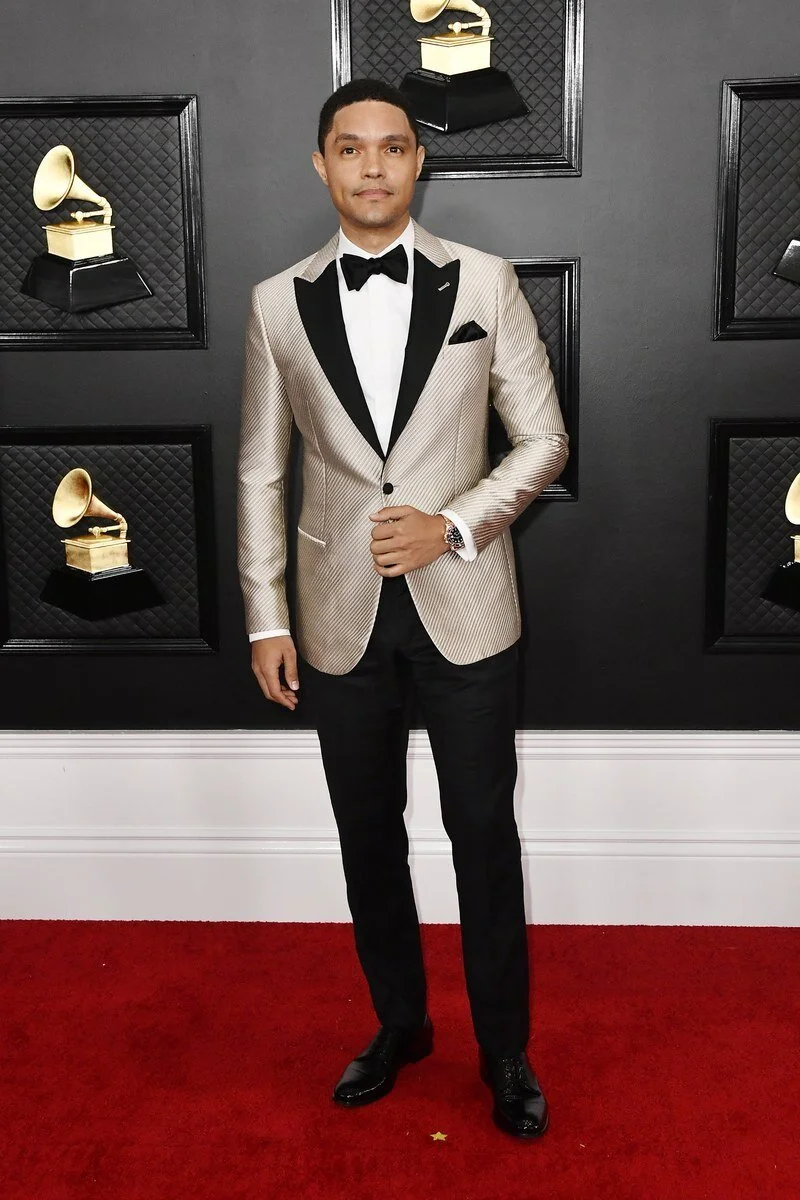 While still a bit lackluster, Trevor Noah still managed to pull off a dreamy pop of champagne in his black and pale gold contrast suit.