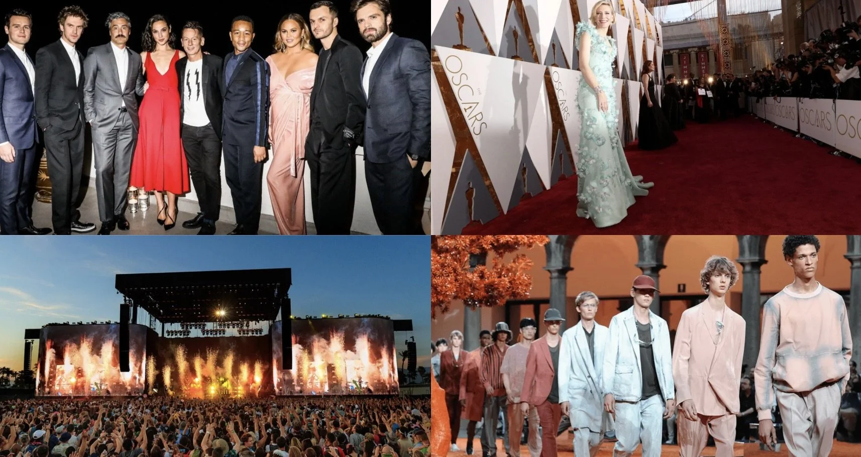 Photos: GQ Men of the Year 2025 Party (top left); Cate Blanchett at the 2016 Oscars (top right); Coachella Valley Music and Arts Festival, 2017 (bottom left); Milan Fashion Week, Ermenegildo Zegna's runway show, 2025 (bottom right). All photos sourced from Cornucopia Events ™
