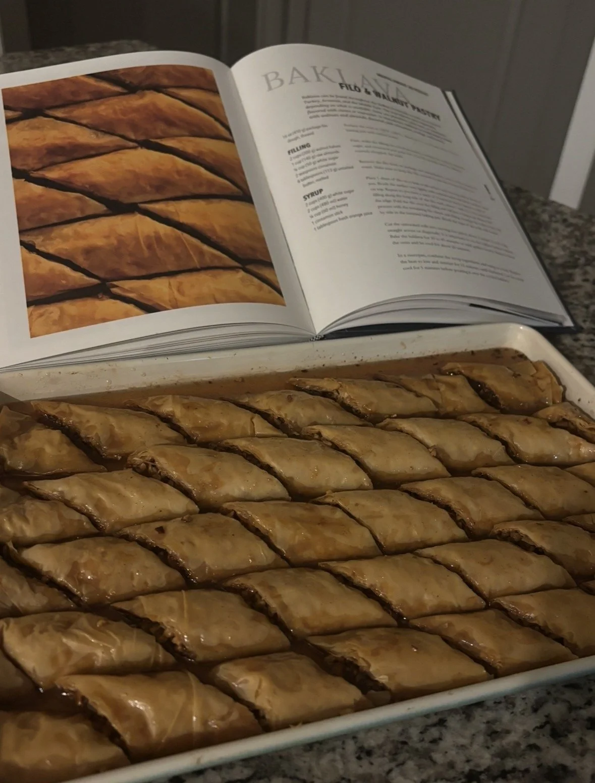 Phyllo dough is fragile. It dries in minutes if you don’t cover it with a damp towel — something I learned after the top sheets started cracking like old paper. I frantically removed the towel, dabbed butter between layers (because we don’t own a pastry brush), and carefully sprinkled the mixture of crushed walnuts, almonds, sugar and cinnamon. The mixture was hand-chopped by me because we don’t own a food processor, and I may or may not have injured myself during the process.