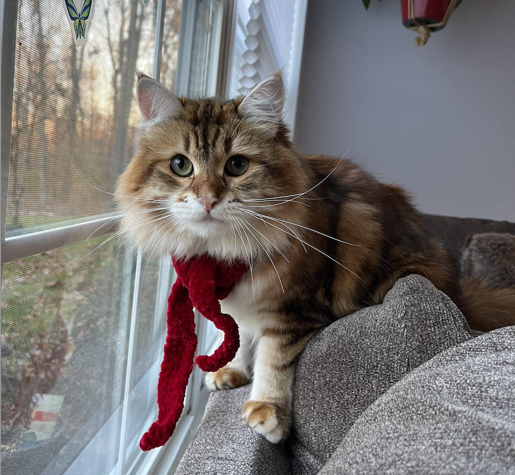 Said high school sweetheart’s cat wearing a scarf I made him.