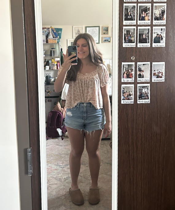 Review: This outfit served from head to shorts. I guess you could say I was not a fan of the chosen footwear. I thought the Uggs brought the sincerity of the fit down a little bit. Perhaps a pair of sneakers or sandals could have elevated this look more. I did, however, really like Lindy’s floral top in this outfit and its pairing with the light-wash shorts. It was a good color scheme for the end of summer and transition into fall. Unfortunately, the shirt did take some battle wounds over the course of the day. Do not fret, we will fix it and she will be able to hit the town in it again. If you haven’t noticed already, I will point out that these are the same jean shorts from the previous day. Lindy tells me it is good for your jeans to not wash them too often. I appreciate her concern for the fabric’s well-being and our dorm’s water bill. And she justifies the Uggs with the fact that she received a student discount on them. Overall, solid fit, 7.5/10.