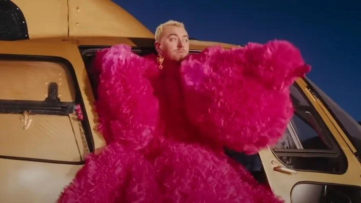 Pop artist Sam Smith began their career in the 2010s, offering a soulful sound to their ballads. Their early music videos featured black-and-white film, sinking into the essence of heartbreak through cinematography. The wardrobe stayed rooted in classic black suits, as the voice was the main focus. After coming out publicly as non-binary in 2017, Smith began a new journey of self-identification through their music and personal style with albums like The Thrill of It All and Love Goes.